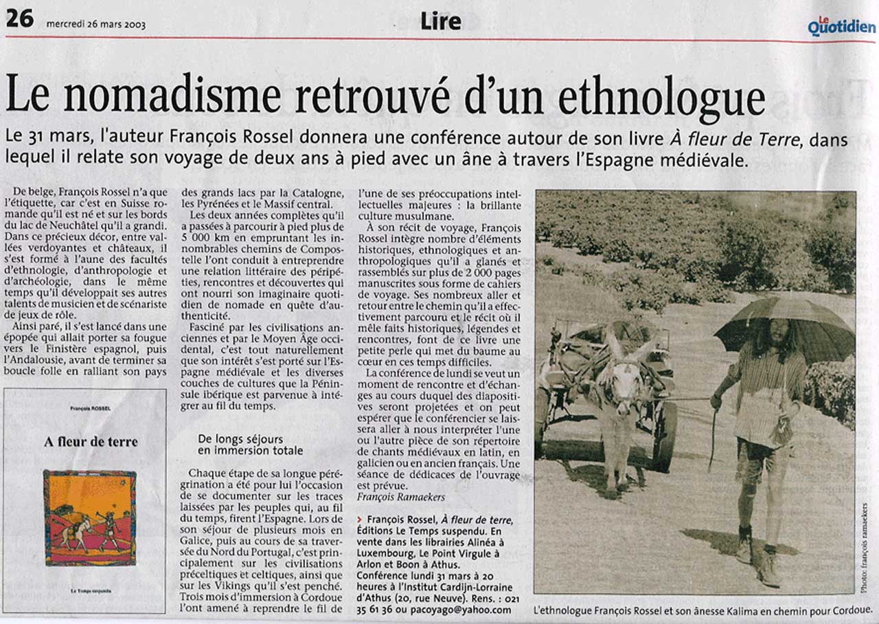 A fleur de terre dans la presse et les médiaRadio Aria, 12 avril 2003François Rossel parle de son livre dans l'émission d'Isabelle Kurth. Ecoute en ligne possible si vous avez le plug-in Flash 6.0.40 ou plus récent. Sinon, téléchargez le fichier mp3.